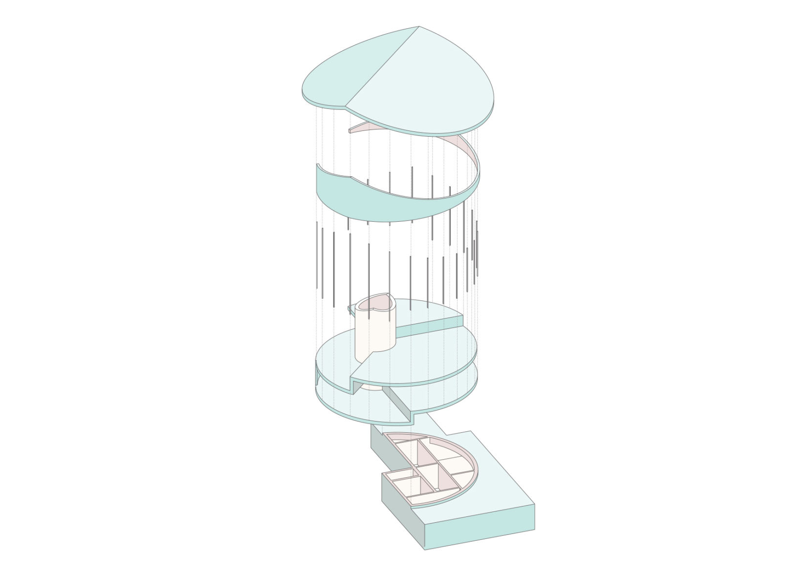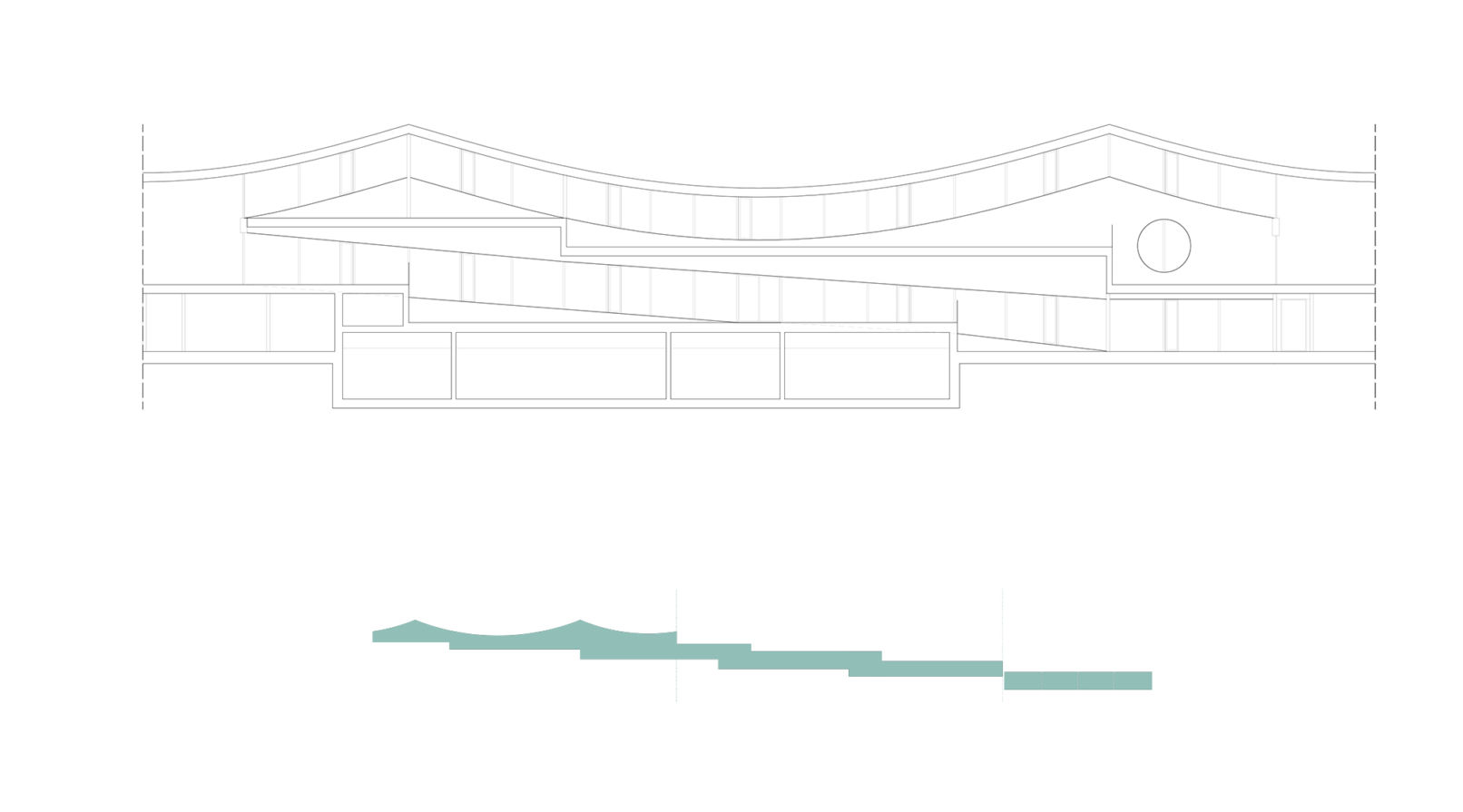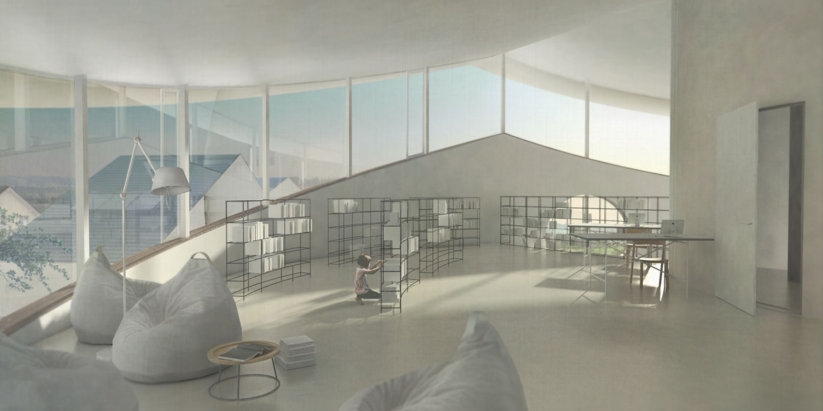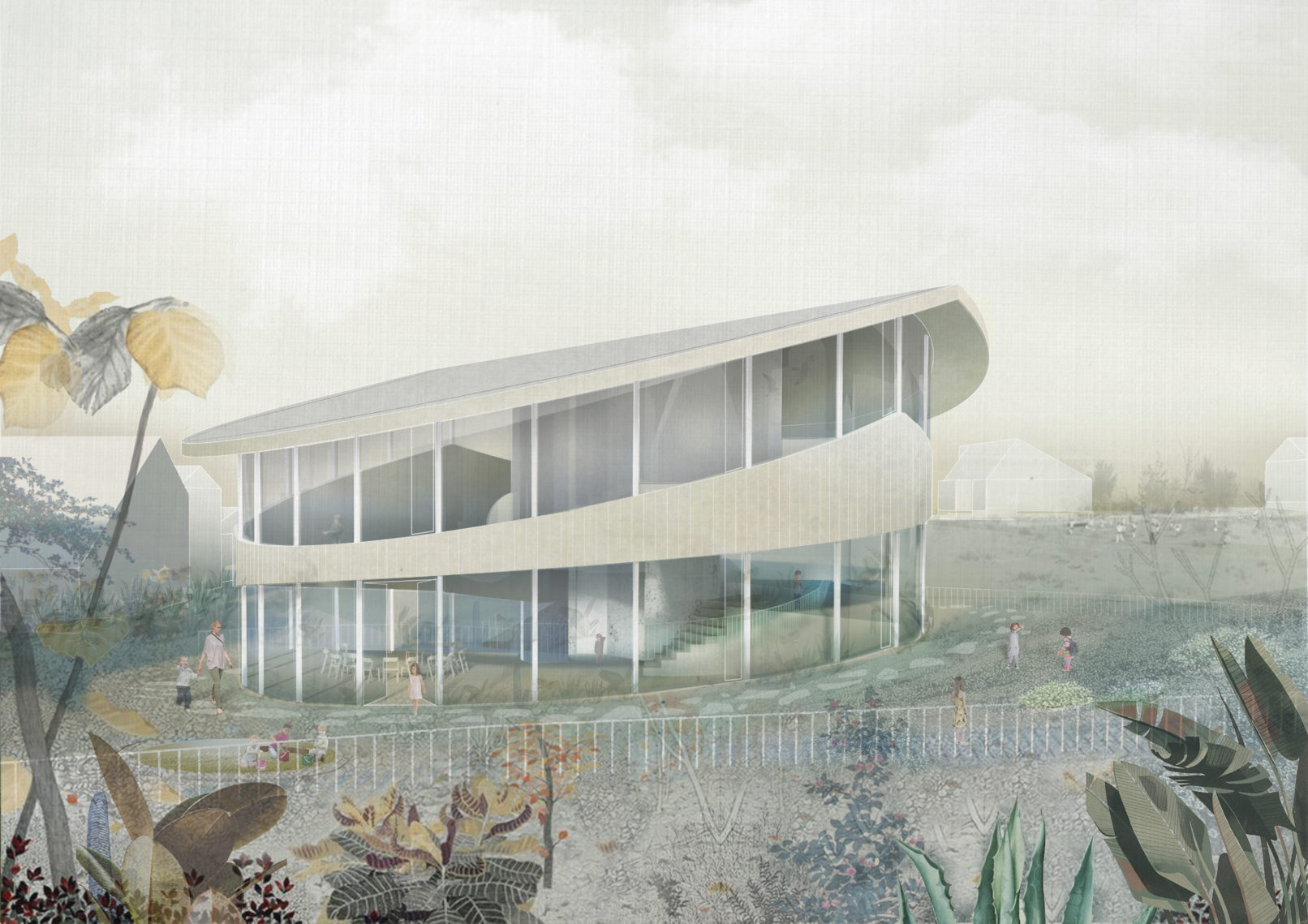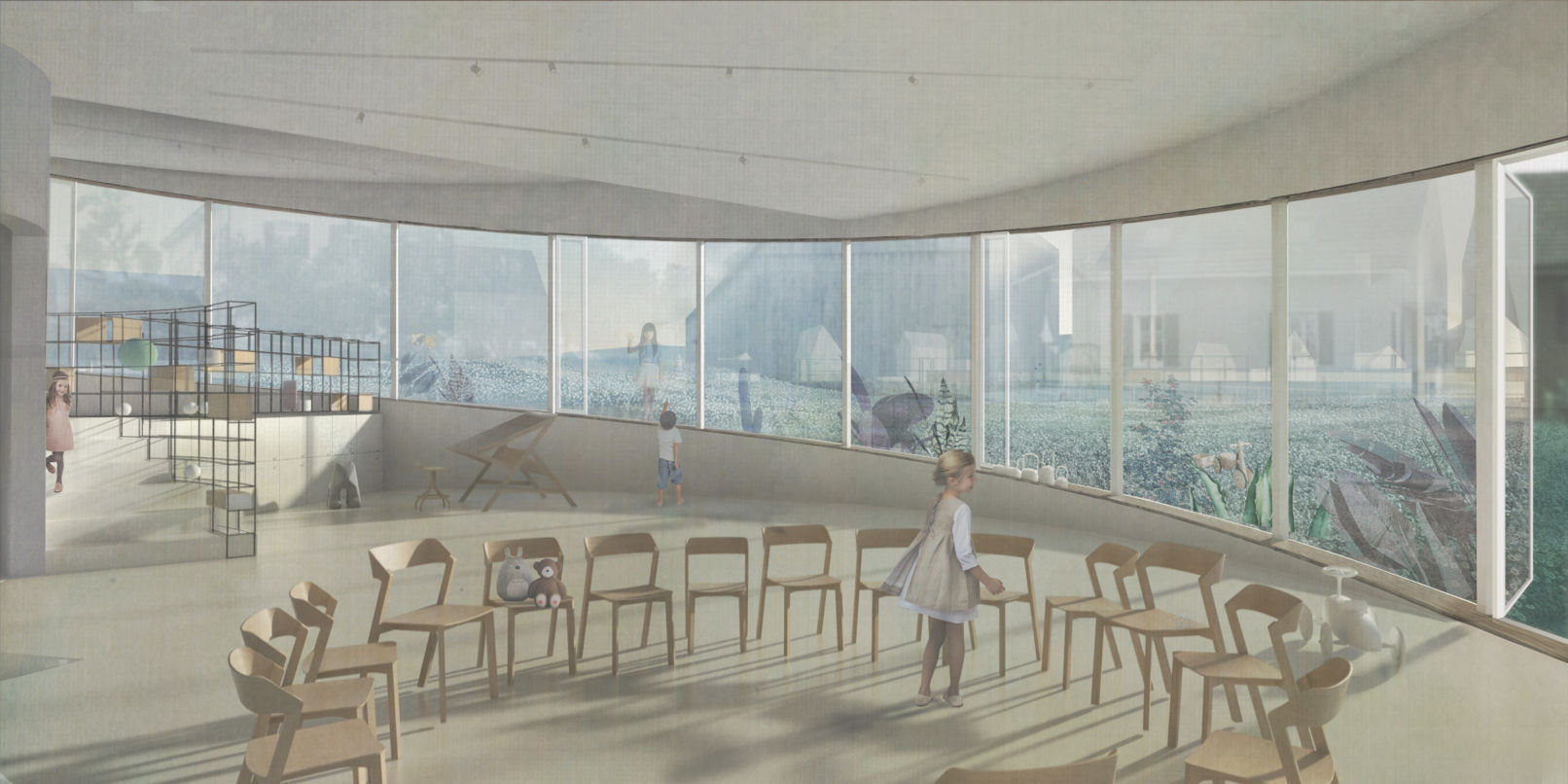 The round form of the new building is designed so to be in contrast to its neighboring housing buildings in order to differ private from public. The covered main entrance of the building is positioned at the same topographical level like the school. Via a side entrance, the lower floors are directly connected to the topographical level of the lower village. A continuous, ring-shaped spatial continuum connects the kindergarten spaces with the school area at different heights on the level of the village and the school via two spins from the bottom up. The individual interior spaces are zoned by terracing the interior and are visually connected to each other. A contiguous space is created, which can be divided if required. At the same time, every room has a strong outdoor space connection. Thanks to the central core with an elevator, all rooms can be used independently of each other and barrier-free. The spatial continuum and the regular system across all floors allows flexible use of the rooms. The circular shape allows the architectural program to be placed in a specific relationship with the surrounding outdoor spaces. The outside space is understood as an extension of the actual kindergarten space and promotes learning from nature. For this purpose, the supporting structural elements are concentrated in the façade and in the core.