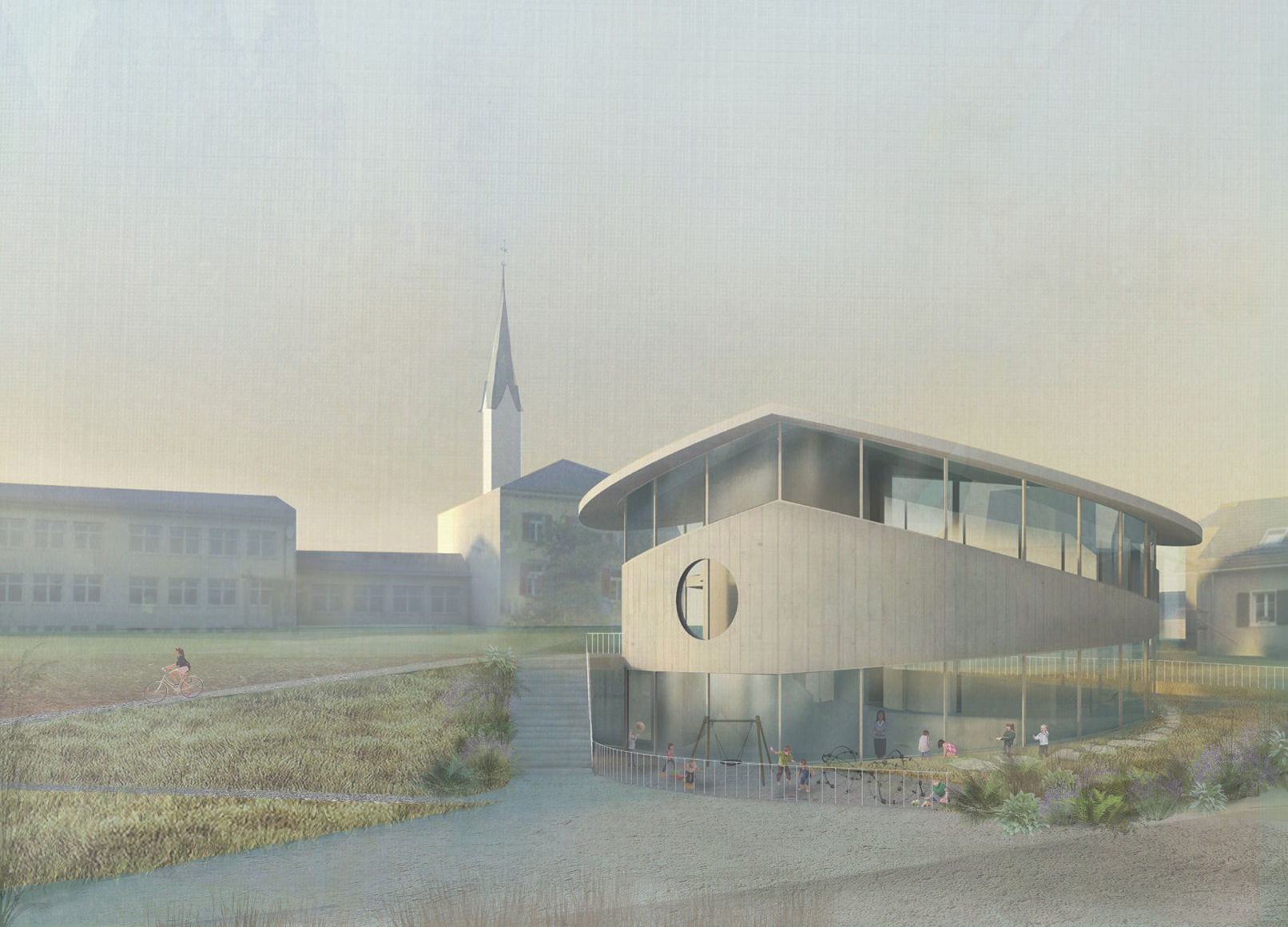 The school, with its associated open spaces and the nearby church, is both a spatial and a content-based center of the village of Zihlschlacht. The topographical edge in the south, further reinforced by the sports field, forms the boundary between the school and the village. At this intersection is the new kindergarten building. The main idea of the project is to highlight the relationship between the school and the village.