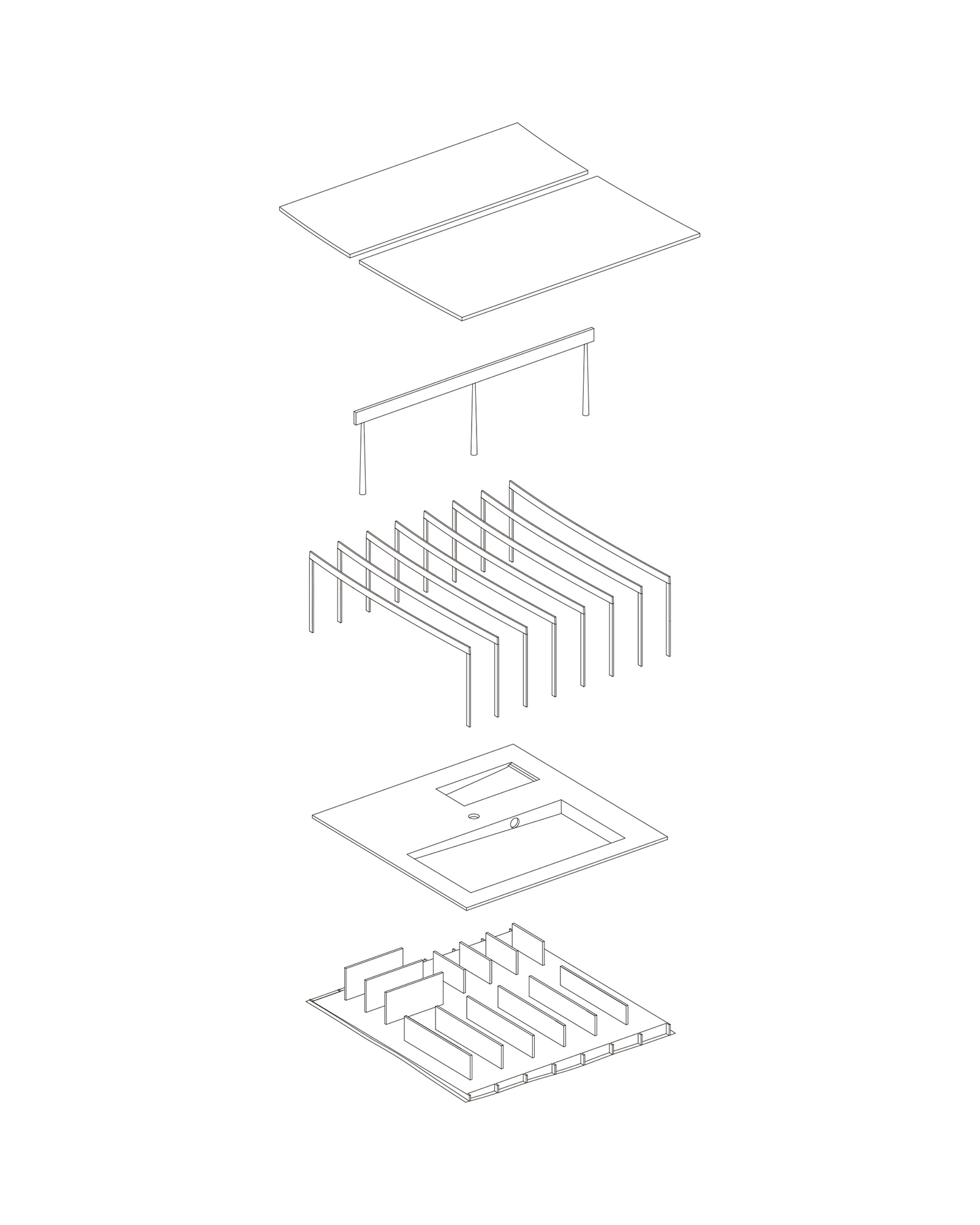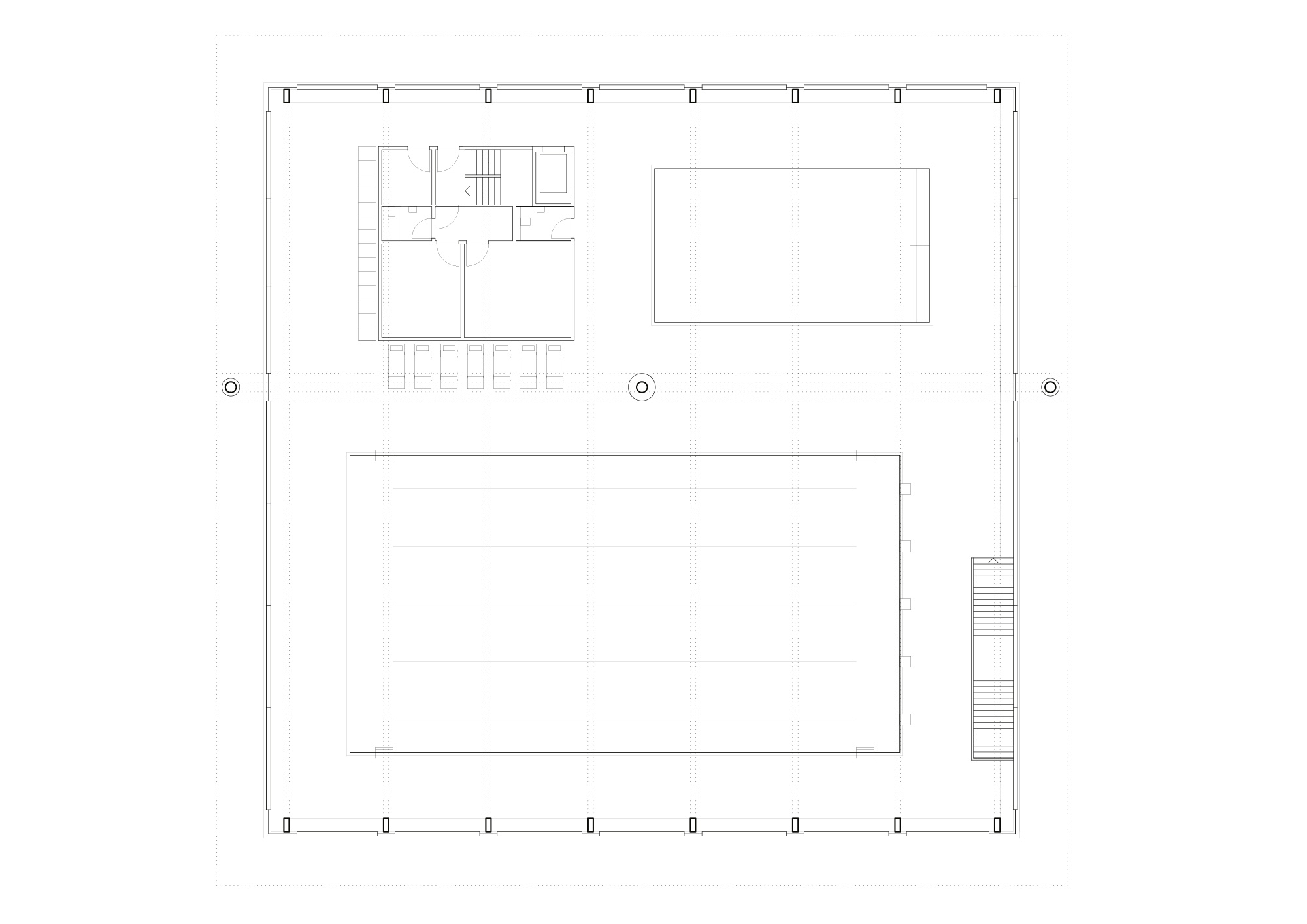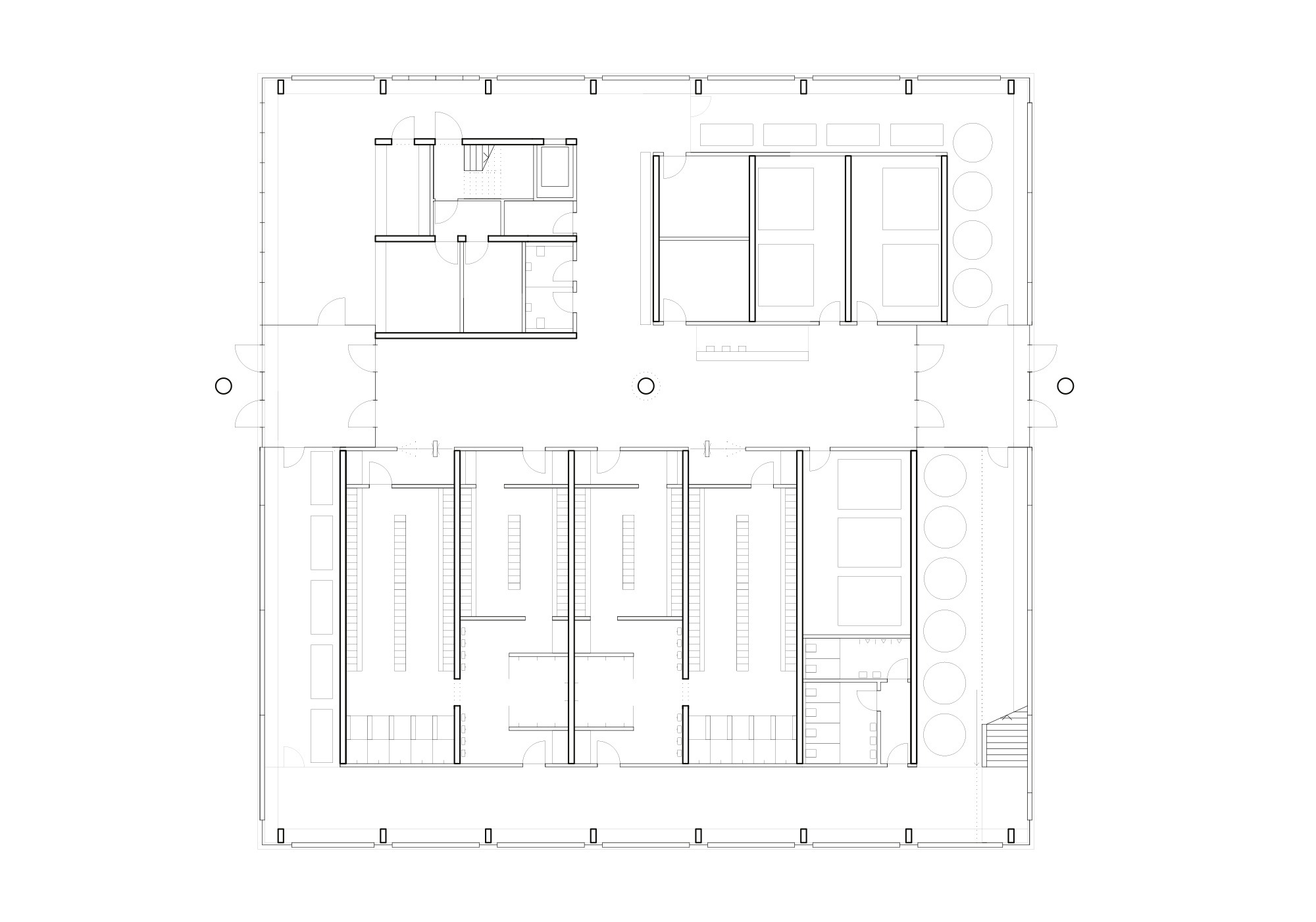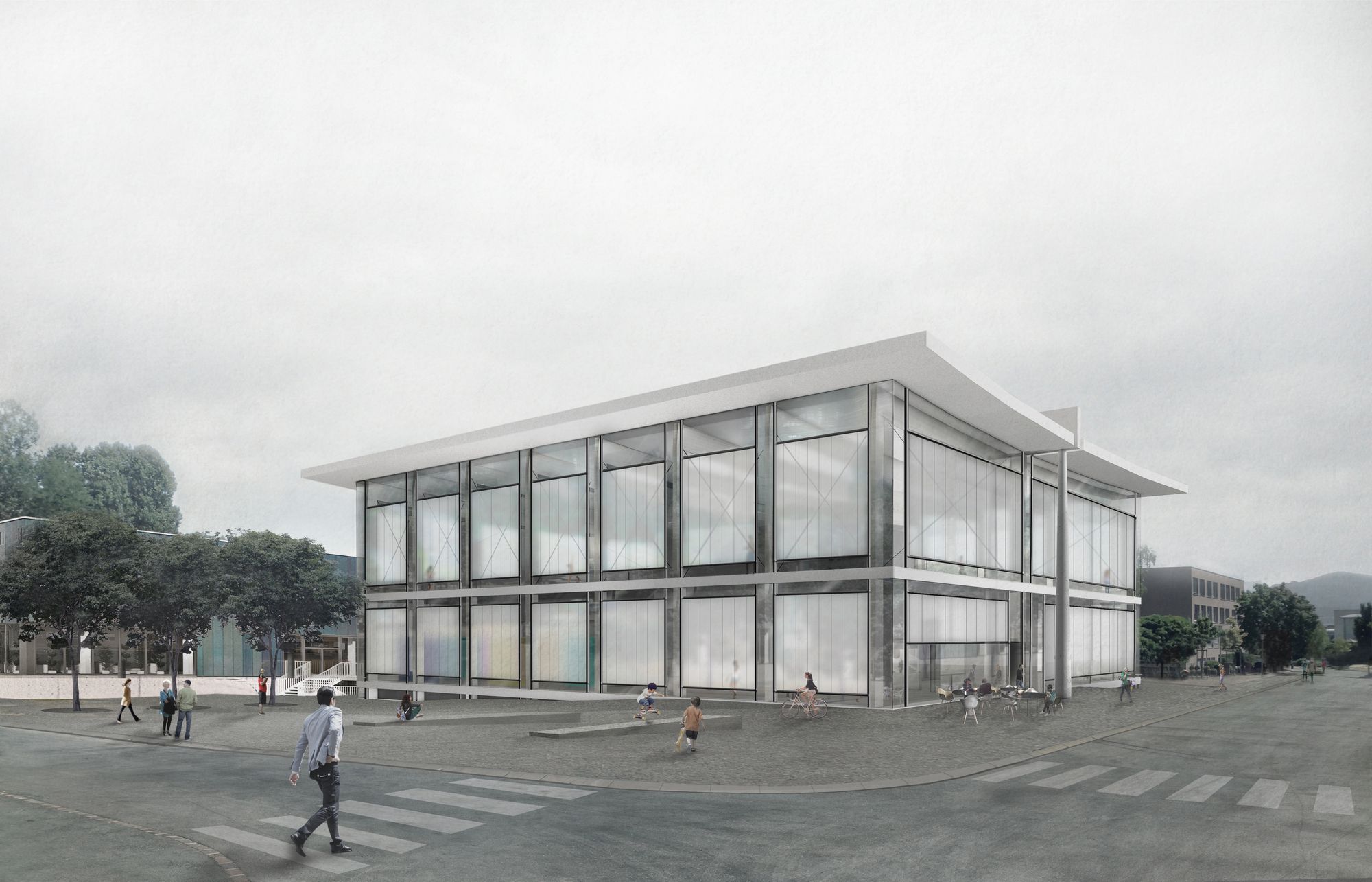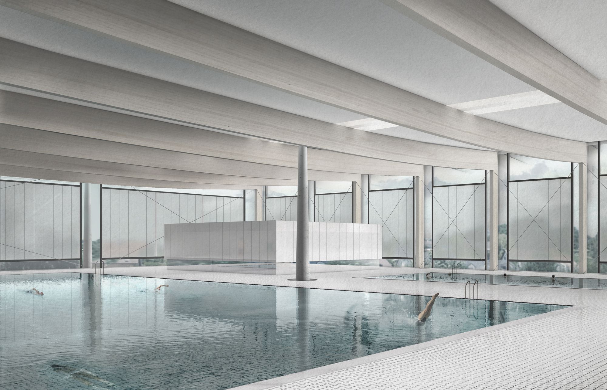 A wide corridor connects the main street with the existing sports hall, creating an internal street with punctual visual connections to the swimming area on the ground floor. This space serves as the entrance hall for the pool, wherefrom changing rooms, a restaurant and all serving functions are accessed. The two basins are on the 1st floor. They form a folded concrete plate that differentiates the ground floor in its height and function. The loads are transferred through a cross-wall construction system to the ground. A curtain wall facade and a wooden roof enwrap the whole space.
