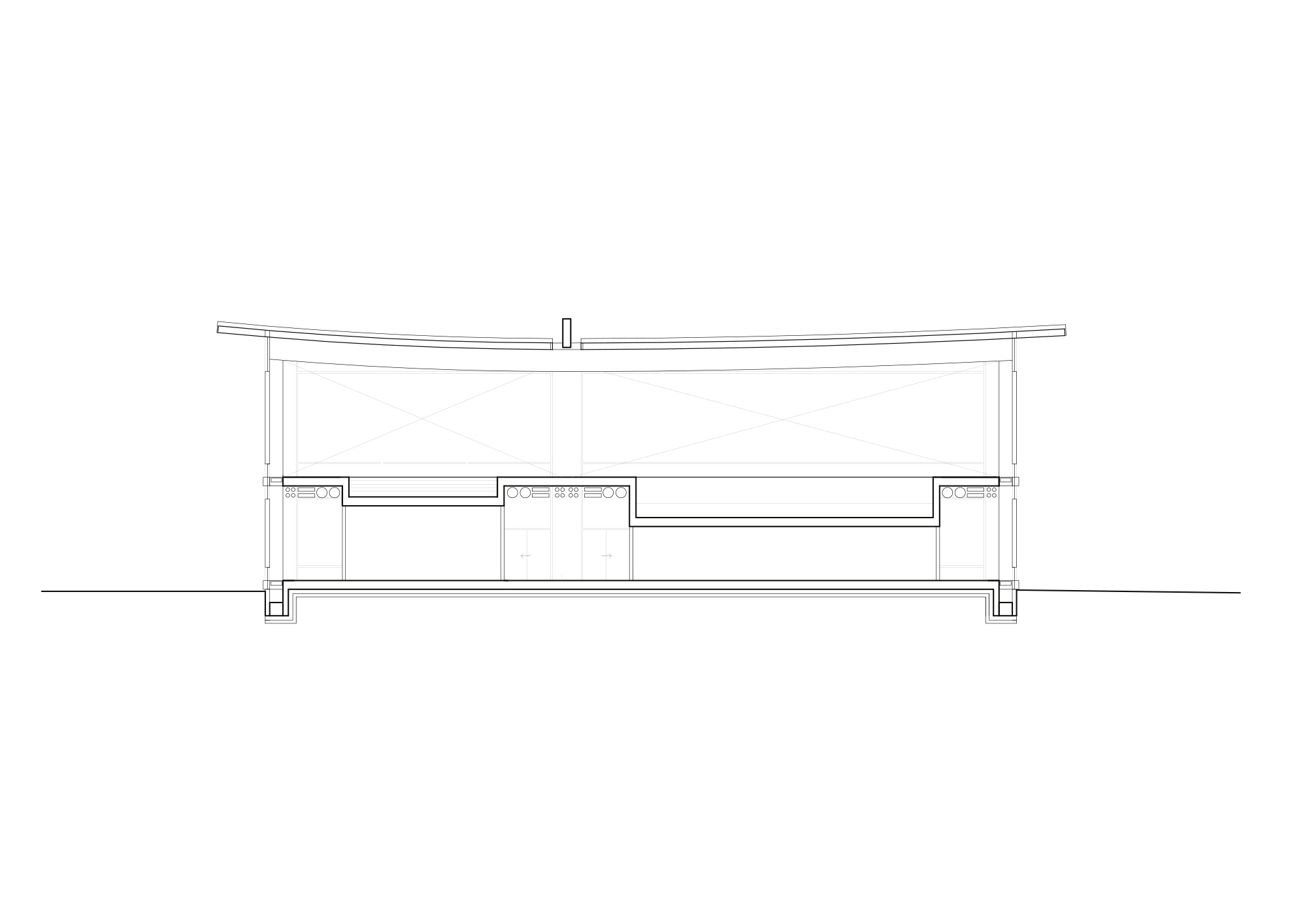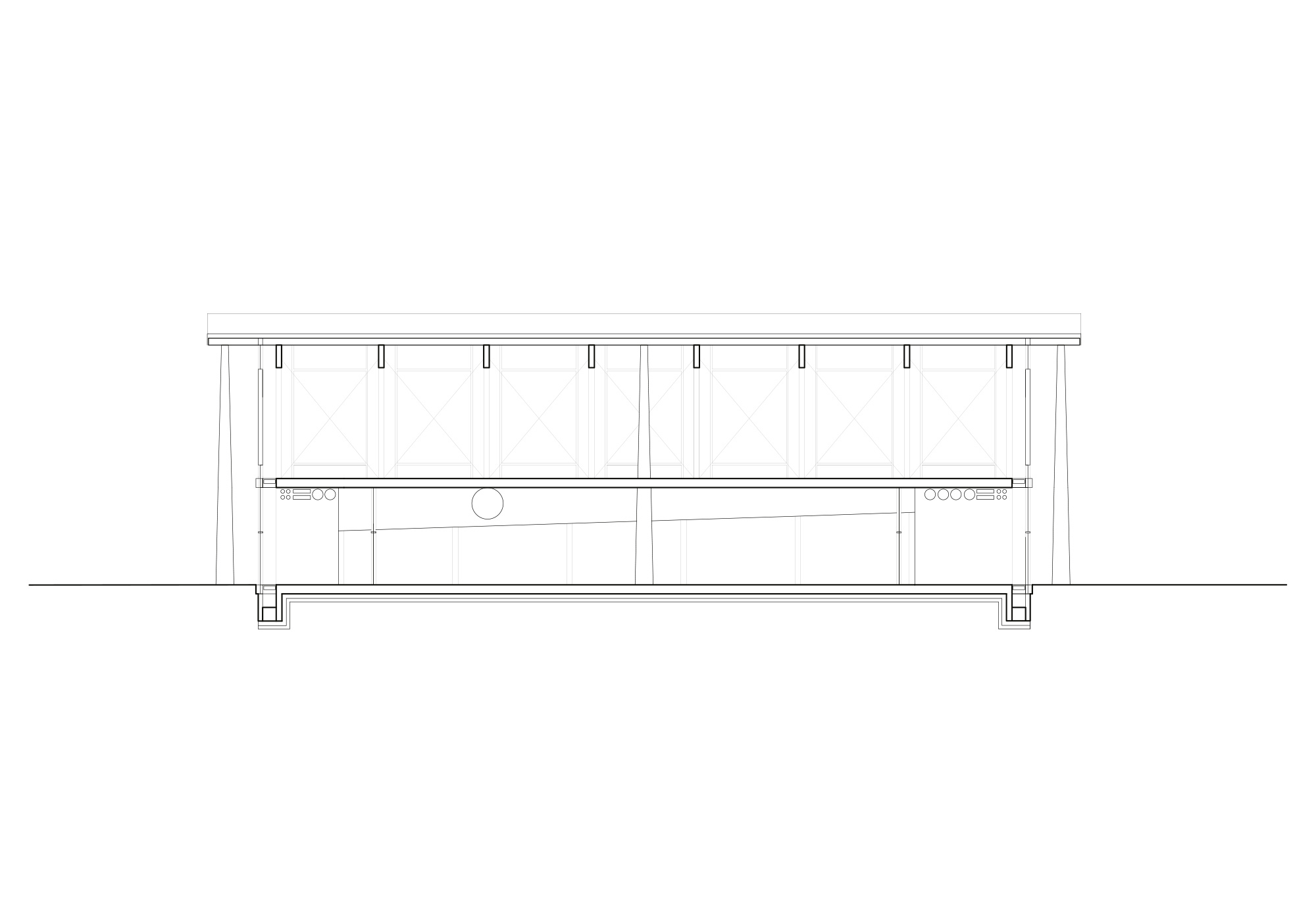 Two superposed systems of structural frames are independently conceived and are supporting the facade and the roof. Their directions are derived from the movements in the building and the relation of the facades to their urban context. Rhythmically placed wooden frames on the long sides of the pools create vertical divisions relating to the repetitive movements of the swimmer. One exposed concrete frame lies above perpendicularly and supports the wooden structure in an economical manner. This frame reinforces the direction of the internal street and marks the entrances. Transparent glass panels follow the different structural systems and highlight the swimmers horizon, creating an alternating pattern with translucent infills.