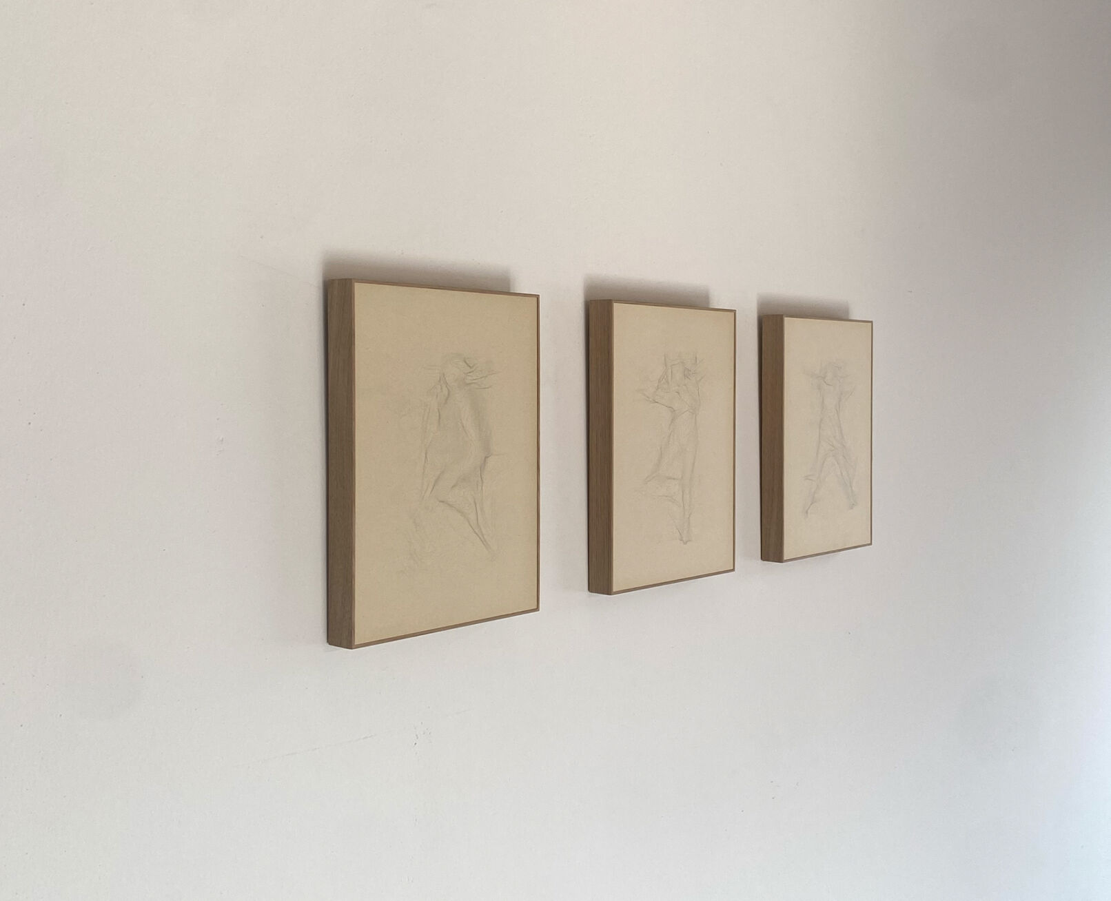 Series of three drawings on aged paper, 21 × 29.7 cm